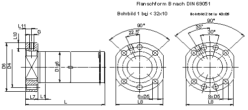 Eingängige Flansch-Doppelmutter nach DIN 69051 mit Schmierbohrung und Befestigungsbohrungen.